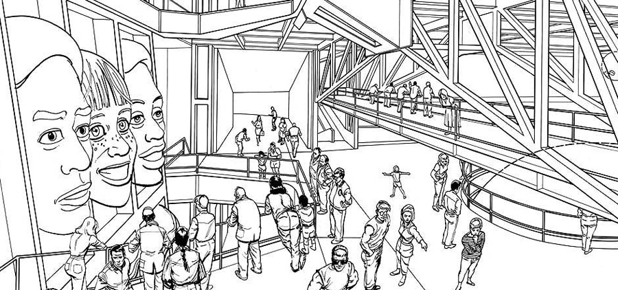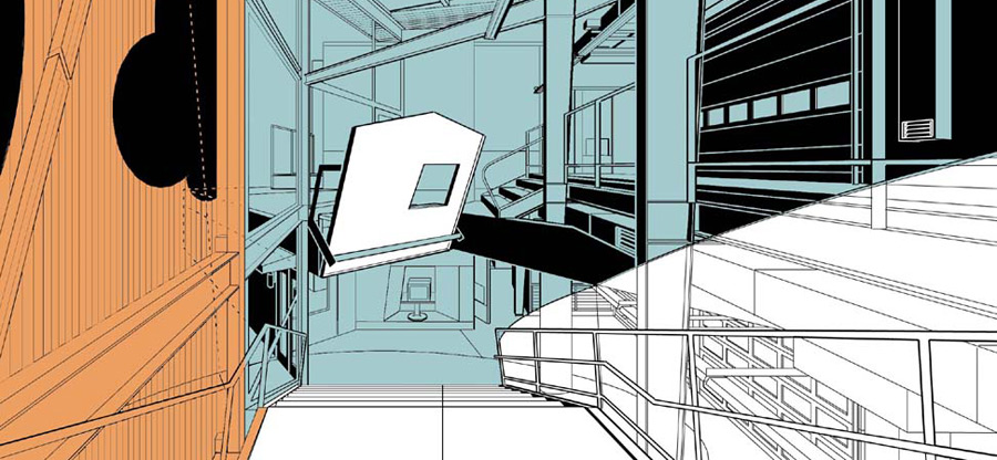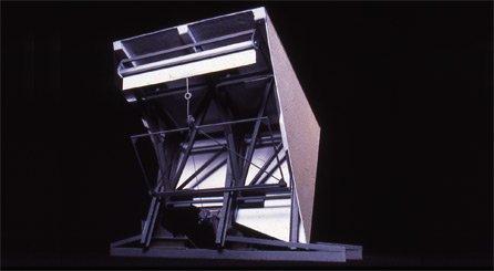 configuration of studio and gallery space can be accommodated. From all gallery to all studio, or anywhere in between, the space can be swiftly changed as requirements dictate. In addition, this spatial strategy is reinforced by a lighting/observation “catwalk” system which runs throughout the building at the third level, where the administrative and gallery storage elements of the program are found, which provides for security and a continuous tuning of the environmental conditions of the galleries.
