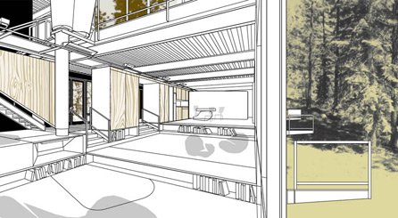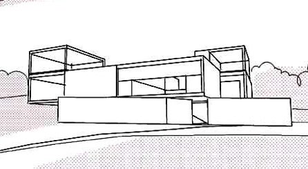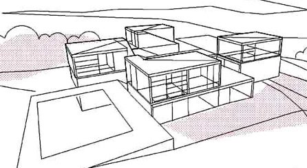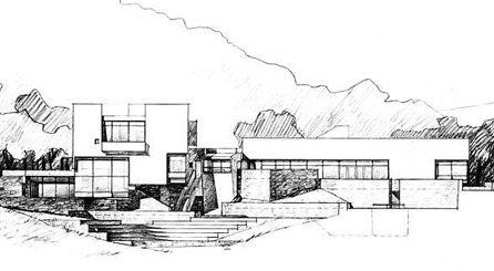 The architects were asked to prepare alternate schemes for this site from the same basic diagram supplied by the client. This diagram included a large living space combining living, dining and den and a separate bedroom wing.