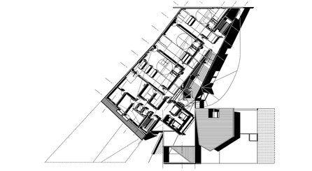 Scheme * fits the program into two linear, single story, steel-framed and-clad volumes, arranged along the principal topographic axes of the site.In this case the living spaces occupy the lower volume, which faces the principal view. The resulting stepped-chevron form produces a large outdoor deck on the roof of the lower volume. Where the two bars overlap at the corner, a double-height volume is created; here vertical circulation and a hearth are accommodated. A mechanical room and storage area is provided in the space below the lower level.