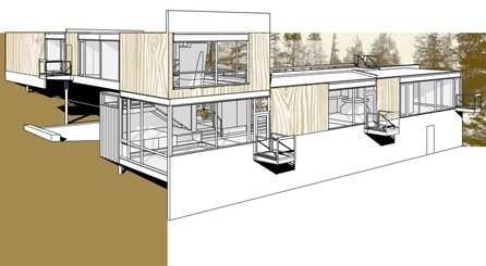 All structures will be constructed from twenty-foot shipping containers. In industry these containers are used as a basis for temporary shelters all over the world, as well as the shipping purposes for which they were originally designed. They are extremely hardy and very inexpensive. It goes without saying they are eminently transportable. Each of these factors recommended their use for this project. The remoteness and difficult topography of the proposed building sites require that the structures be delivered to the property by truck and then ari-lifted by Sky Crane helicopter into place on the specific building sites. The inexpensiveness of the containers allows the architects to propose extensive modifications, within a general modular approach, without busting the budget. The durability of the containers provides for a measure of security, weather and fire resistance not common in vacation homes, but important because of the lack of a constant owner presence. And the mobility of the containers allows the construction standards for the units to be raised considerably since the entire assembly can be shop fabricated. In fact, much of the design effort has been spent ensuring the road – and air – worthiness of the module units. This has led to the basic telescoping design and accounts for the apparent spatial or constructional inefficiencies evident in the doubled walls and columns. It is the architect’s intention that these contingent effects of the structure’s unique genesis be seen as sources of visual interest, revealing as much integrity and appropriateness as the veins in the surrounding rocks, or the pine cones which interrupt the “pure lines” of the tree.