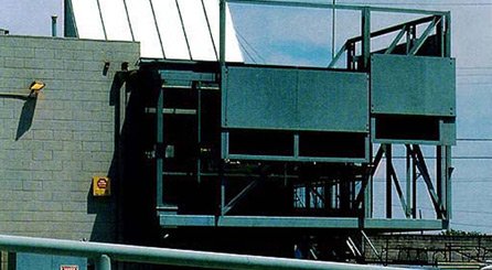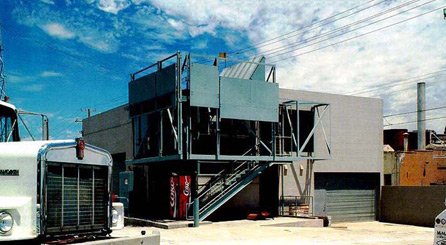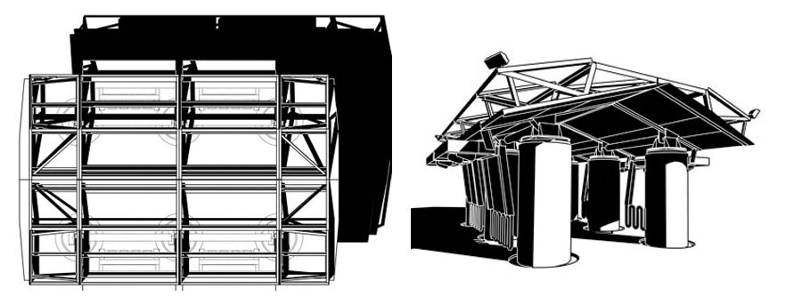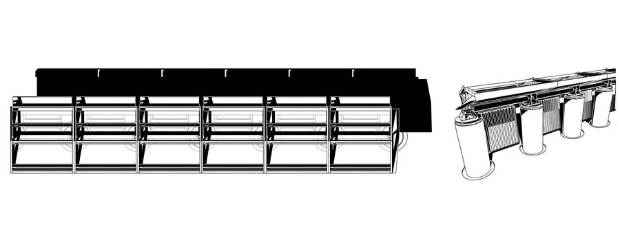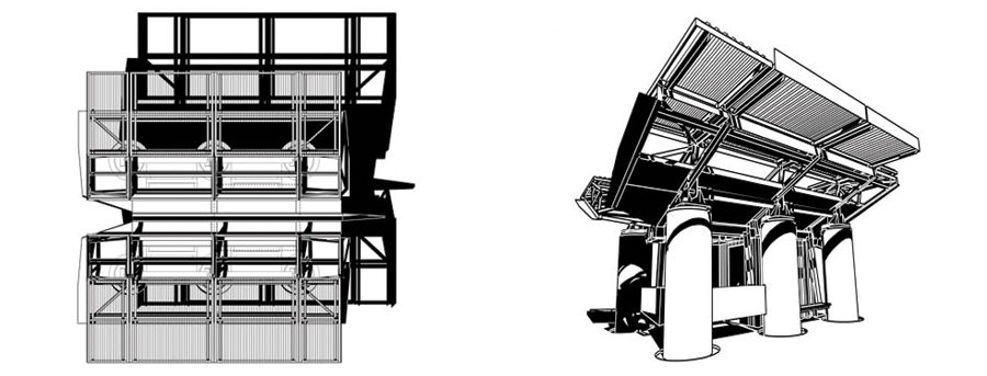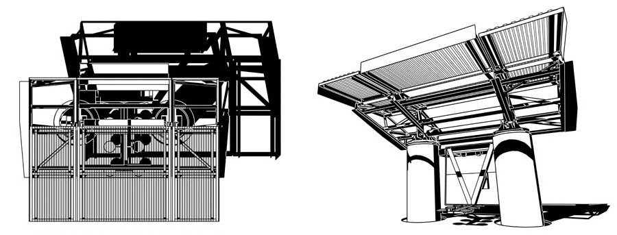 Movement provides the means by which these buildings achieve a flexible relation to the site and context throughout the day. Units move across the site laterally on rails, using conventional bridge-crane technology, including hoses and cables for power, waste, and water. The seventeen-ton units are manually driven by a stationary bike device; it takes 6,000 pedal rotations to move from one side of the yard to the other.