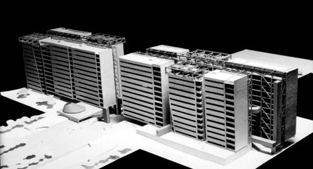 The architecture of this design is composed of two systems–a concrete envelope and glass and steel connective tissue–which carry the architectural theme while satisfying the programmatic requirements. The envelope contains the spaces where the required program is housed. The connective tissue is the interdepartmental circulation zone which joins these spaces to each other. The basic servant-served relationship between these two zones is maintained in both the City Government building and the City Council building, but the manner in which the relationship is embodied varies in order to highlight the significant differences between the two buildings and their programs, The glass and steel servant structure is the active element in this relationship, while the concrete volumes play it more straight in both cases.