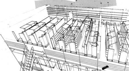 This scheme derives its distinctive architectural features from a desire to balance a rigorous support of specific program requirements with the flexibility to respond to the continuing evolution of the program. Included in this is a concern for the “phasability” of the project—could it be built one-piece-at-a-time while remaining architecturally and institutionally viable during all steps of the process? Within the distinctive structural and planning grid borrowed from the grain of the surrounding residential neighborhoods, the gallery portions of the building break down easily into flexibly combined sub-assemblies of standardized space- and construction-units. The more programmatically distinctive portions of the building—the performance space and the lecture hall—find accommodation within the system withoutcompromising the flexibility of the less determined spaces. A unique feature of this approach is the non-specific allocation of the temporary gallery and resident artist studio spaces: a system of rolling overhead doors allows a continuous reconfiguration of the generic loft-type space. In combination with the sideyard, north-facing light wells, which provide secure, controlled exterior access to all parts of the loft space, as well as the strategically located internal gardens, this system ensures that any