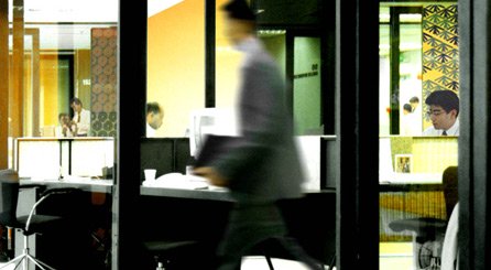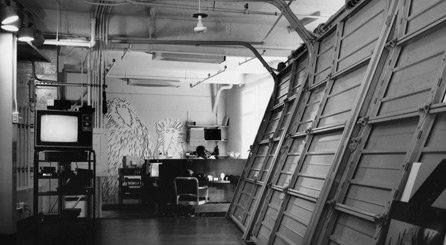 In this project sliding glass doors are used extensively in parallel ranks to divide up what might otherwise be an open office layout. The glass sliders are not simply a metaphor for corporate transparency or display of its positive effect on efficiency; in fact, they create flexible space divisions in support of a hoteling-based organizational structure. By opening and closing the doors in various combinations, the schooling fish/consultant’s hot desks are allowed to coalesce into larger work group table areas or divide again into individual private office spaces. Conceived as a physical expression/embodiment of Andersen’s mantra of corporate flexibility through flattened hierarchy, this scheme was intended as a model for Andersen to use in demonstrating to their clients how the physical environment could be more supportive of the recommended business model. In addition to the partitioning and layout of the floors J,P:A designed furniture, graphics, and lighting for the client. Among the furniture pieces were desks, chairs, tables, and hoteling carts. These carts, invented by J,P:A but now in wide use, held the consultant’s files and effects in a lockable mobile version of a filing cabinet/storage locker and could be wheeled around to wherever the consultant was camped out and then re-docked in centralized security areas at night.
