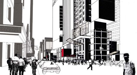 In keeping with the importance of the building, only real materials, used as themselves, are proposed. These are, simply, classically: steel, glass, and concrete. In fact, if the local conditions permit, we would like to see a weathering steel, since it need not even suffer the indignity of paint. Weathering steel wears as well as stone, and like stone it quickly invests the building with the timeless dignity of noble materials placed in negotiated balance with nature. For the glass areas—so important in communicating the interior life of the building to the plazas surrounding and feeding it, and in creating the sense of night time magic—we propose Dichroic glass, as part of an innovatively detailed and richly configured curtainwall structural system. At the base, for the parking plinth and elevated entry plaza, concrete with a suitable level of finish seems most appropriate. Budget permitting, stone, of course, would be preferred here.