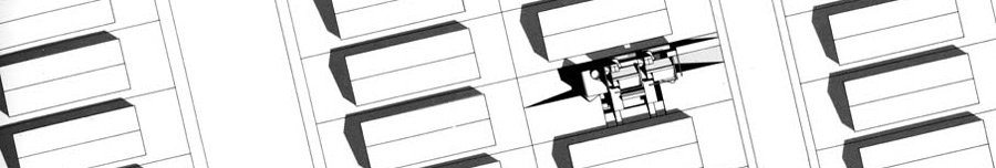 Though the museum will front Olympic Avenue, a commercial street, it will extend well back into the residential neighborhoods to the north. Existing between these two radically different contexts, it will be important for the museum to balance competing expectations. The present scheme accomplishes this critically, through the interaction of a number of formal systems. The grain of the residential subdivisions, for example, which formerly split up the site, is continued in the new museum by incorporating the typical front, rear and sideyard setbacks of the former lot divisions into the structural and planning grid of the design. The figure of the building spans across these divisions, though, to impart a commercial scale and institutional presence. Balance is achieved through sectional manipulations which respond to the sloping of the site and the height restrictions varying between the neighborhood to the north and the commercial strip along Olympic. The logic of the lot divisions is maintained in the internal layout of the design: the “sideyard zones” are distinguished from the “front and rearyards” as circulation, while the “buildable areas” in the subdivision organization are reserved for the more contained exhibit areas. The civic dimension is communicated by the design as it registers the interneighborhood shifts in the surrounding subdivision grids, presenting this dynamic on the facade and inscribing it in plan.